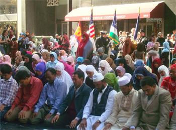 Это можно было увидеть в Нью-Йорке каждую пятницу с 2-х до 4-х после полудни в дни исламского праздника. Толпы молящихся не помещались в близлежащих мечетях и располагались на центральных улицах города (Мэдисон Авеню и 42-ой ул., 94 ул. и 3 Авеню и др.), блокируя движение транспорта.