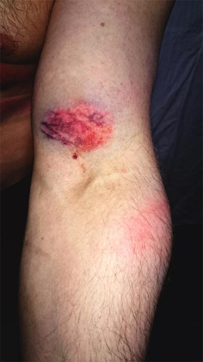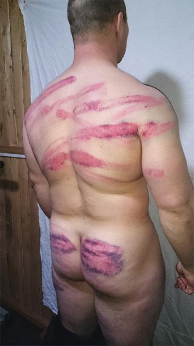 Наличие линейных чётких границ нанесенных повреждений явно указывает на то, что эти повреждения были нанесены предметом с чёткими краями (палкой, дубинкой резиновой). Так, начало и конец нанесенных повреждений - чёткие, что соответствует ширине и длине этих предметов. В центре - менее красные, это бывает от удара более тяжёлым предметом, выше указанным.