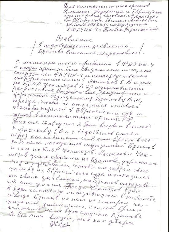 С момента моего прибытия в ФБУ ИК -4, я неоднократно был свидетелем того, что сотрудники ФБУ ИК -4 и непосредственно оперуполномоченный Лысиков Е.В и зам .по БиОР Чекмазов. В.Ю. осуществляют репрессивное воздействие, запугивают и угрожают осужденному Бунтову В.М., требуя, чтобы он отказался от своей жалобы, поданной в Европейский суд и жалоб в компетентные органы РФ.