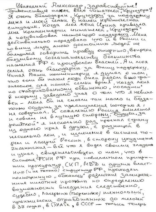 Я очень благодарен "Кругозору" за поддержку меня и моей семьи в нашей критический ситуации. Когда моя жена Ирина привезла мне комментарии читателей "Кругозора", я почувствовал настоящую поддержку. Меня действительно порадовало, что и в России, и по всему миру много достойных людей, не боящихся говорить правду открыто, вопреки боязливому соглашательству большинства населения РФ с произволом властей.