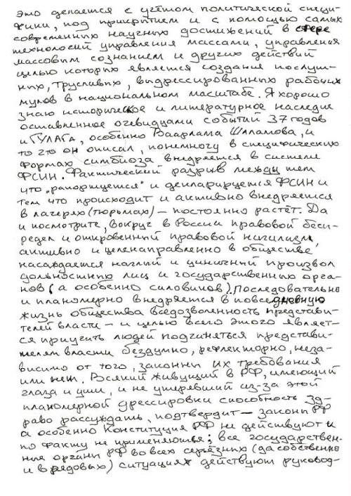 К сожалению, Россия меняется и совсем не в лучшую сторону. Будучи за решеткой, я несколько раз проехал страну из одного края в другой с разницей в несколько лет и изменения в системе тюрем и лагерей России в сторону ухудшения гигантские. Всё, что я видел своими глазами, и узнал, свидетельствует о том, что в системе ФСИН РФ при повсеместном прикрытии прокуратур, СКП, МВД и других властных (и не только) структур, проходят полноценную обкатку различные засекреченные пилотные проекты по определению возможности внедрения следственных, судебных и лагерных (тюремных) технологий, практически отработанных до мелочей в 37 году в ГУЛАГе, в СССР. Только теперь это делается с учётом политической специфики, под прикрытием и с помощью самых современных научных достижений в сфере технологий управления массами. Управления массовым сознанием и других действий, целью которых является создания послушных, трусливых, выдрессированных рабочих мулов в национальном масштабе.