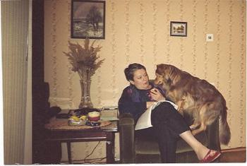 Один случай из нашей совместной жизни с Саньди потряс нас до глубины души. К нам в гости приехал наш старинный друг еще с московских времен. Мы не виделись около пяти лет, так как Валера жил и продолжает жить в Чикаго. После радостной встречи, объятий и поцелуев последовало пиршество. Саньди, приученная Аликом, ходила вокруг стола и попрошайничала, скребя лапой по коленке каждого из присутствующих. Мы не обращали внимания на собаку, так как были поглощены разговором. И тут Саньдюша, взяв свою собачью косточку (трит) из миски, подошла к Валере и положила ему ее на колени. Мы замерли от удивления. Валера, совершенно обалдевший, принял дар и отрезал собаке кусок мяса. Произошел товарообмен, инициатором которого оказалась наша умная собака. Саньдюша по своему общалась со мной, т.е. "разговаривала". Когда с ней гулял Алик, и они приходили домой, я обычно ей говорила: