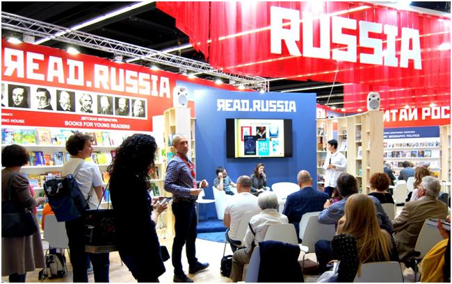 На своем привычном месте в павильоне 5.0 - по соседству со стендами стран Восточной и Центральной Европы - уютно разместилась экспозиция российского объединённого стенда под уже традиционным лозунгом "READ.RUSSIA" - "ЧИТАЙ. РОССИЮ". Судя по моему впечатлению, на этот раз к книгам, привезённым из России и выставленным на стенде, был явно более живой интерес со стороны посетителей. По сравнению с прошлыми годами (а я посещаю книжную ярмарку уже много лет подряд), в этом году - юбилейном - российский стенд пользовался значительно большей популярностью и иностранных издателей, и книготорговцев, и просто любителей русской литературы. Здесь, на площади более чем в 120 кв. метров расположились новинки отечественного книгоиздания: и русская классика, и произведения современных российских авторов, и книги по филологии и русской лингвистике, философии, истории и географии России, издания о культуре и политике, а также произведения для детей и юношества. Всего на стенде, по данным устроителей, было представлено около 700 наименований от более 50-ти отечественных издательств. Также можно будет ознакомиться с переводами произведений российских авторов на иностранные языки.