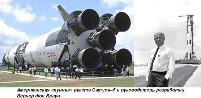 В США лунную программу осуществляла государственная организация - Национальное Управление по Аэронавтике и Исследованию Космического Пространства (NASA). Ключевой фигурой программы был выдающийся конструктор Вернер фон Браун, разработавший в свое время легендарную немецкую ракету ФАУ-2. Американская трехступенчатая ракета Сатурн-5 была разработана под руководством Вернера фон Брауна в Центре космических полетов им. Джорджа Маршалла в Хантсвилле, штат Алабама. Эта ракета высотой 111 метров имела 5 двигателей 1-й ступени с тягой по 680 тонн (!) на топливе жидкий кислород-керосин, 5 двигателей 2-й ступени с тягой по 90 тонн, и один двигатель 3-й ступени на топливе жидкий кислород-жидкий водород. Стартовый вес ракеты около 3000 тонн, вес полезного груза, выводимого на орбиту Земли, около 130 тонн. На пике лунного проекта, персонал NASA включал около 30 тысяч человек, по контрактам с NASA на лунный проект работали известные американские фирмы. Части лунной ракеты Сатурн-5 изготовили авиационные фирмы "Боинг", "Норд Американ Рокуэлл" и "Макдоннелл-Дуглас". Сверхмощные кислородно-керосиновые и кислородно-водородные реактивные двигатели для всех трех ступеней лунной ракеты производила фирма "Рокетдайн", отделение "Норд Американ Рокуэлл Корпорэйшен", - эти непревзойденные двигатели можно увидеть в Аэрокосмическом музее в Вашингтоне (при весе около 8 тонн они развивали тягу 680 тонн!). Лунный спускаемый модуль, экземпляр которого навечно стал главным экспонатом Вашингтонского музея, был разработан отделением корпорации Грумман Аэроспэйс в Лонг-Айленде, штат Нью-Йорк, двигатели для подъема лунного модуля с поверхности Луны - корпорацией Бэлл Аэроспэйс, а приборный отсек лунного корабля - фирмой "Ай-Би-Эм".