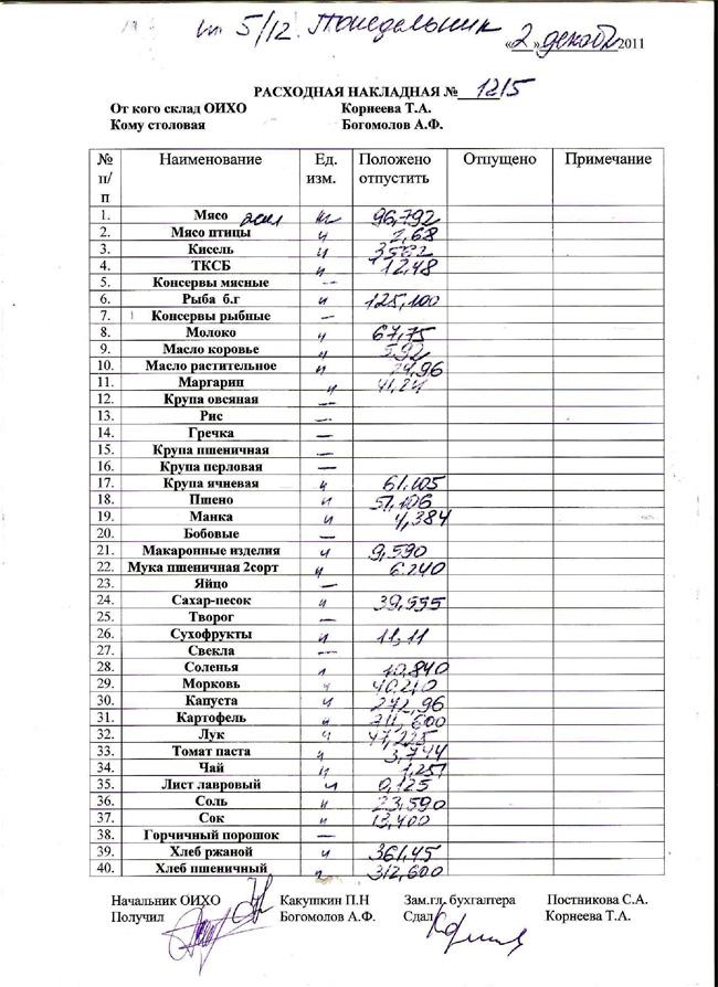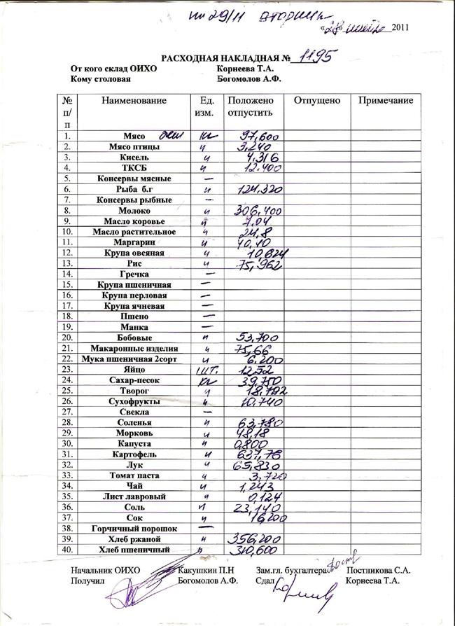 То есть на этих накладных они расписываются за то, чего НЕТ, и удостоверяют то, чего НЕ БЫЛО, так как графа "отпущено" ими в момент подписания не заполняется. Фактически, эти должностные лица, ставят свои подписи заранее в незаполненных расходных накладных, в которых указана только калькуляция необходимых к выдаче в столовую продуктов.