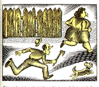 Первым сорвался Харитон. Он напился, не дожидаясь субботы, схватил топор и с криком "Ну, Муська!" стал гоняться за своей женой. Когда профессор, отобрав топор и напоив его чаем, спросил: "Зачем жену гоняешь, Харитон?", тот горестно ответил: