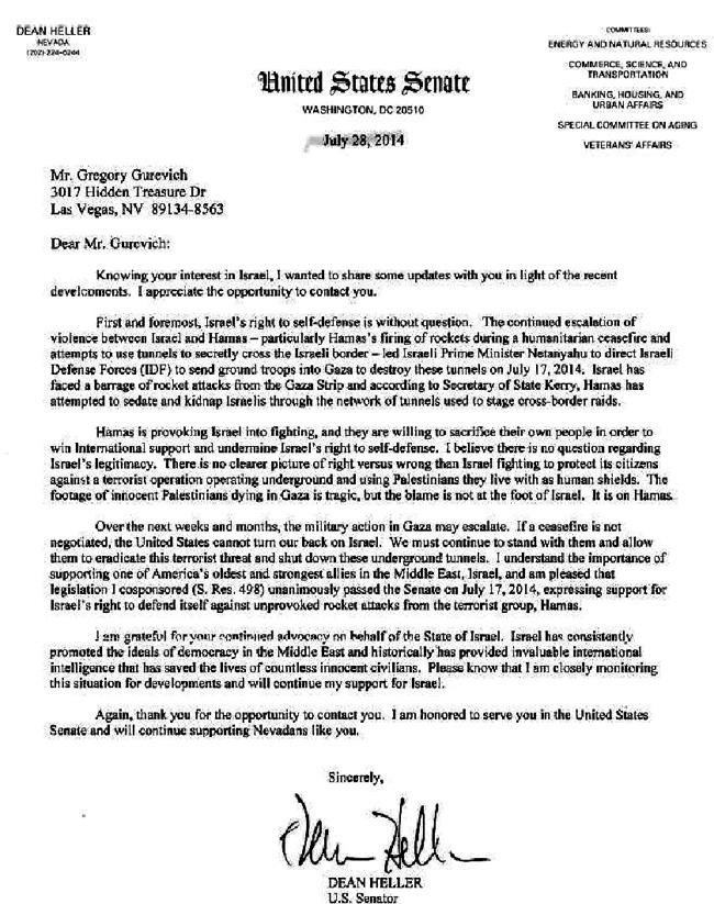 В течение следующих недель и месяцев военные действия в секторе Газа могут расширяться и возрасти. Если прекращение огня не будет достигнуто, Соединенные Штаты не могут повернуться спиной к Израилю. Мы должны продолжать стоять с ними и дать им возможность искоренить эту террористическую угрозу и завершить работу по уничтожению системы подземных туннелей. Я понимаю важность поддержки Израиля, одного из старейших и сильнейших союзников Америки на Ближнем Востоке. Я рад, что являюсь соватором резолюции (S. Res. 498) о поддержке права Израиля защитить себя от ничем не спровоцированных ракетных атак со стороны террористической группировки Хамас. Эта резолюция единогласно одобрена Сенатом 17 июля 2014 года.
