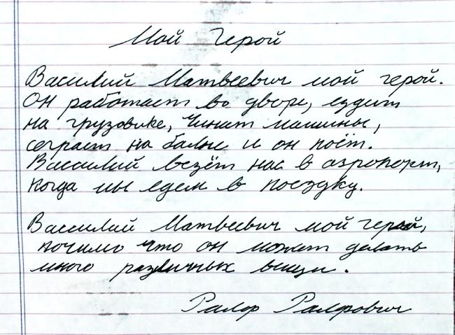 В программе общеобразовательных предметов был русский язык. На занятия приходили не только студенты, но и некоторые сотрудники. В том числе мой лучший друг 60-летний Ральф Хофман, зав.постановочной частью. Он написал на русском языке такое сочинение:
