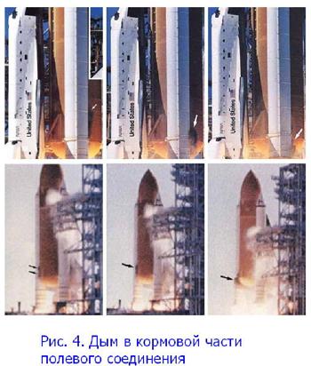 И там же п.15: "...дым в кормовой части полевого соединения в Шаттле при старте (в течение 2,5 секунд после зажигания наблюдались клубы чёрного дыма) был первым признаком неисправности твердой изоляции кольцевого уплотнения ракетного ускорителя 51-L STS".