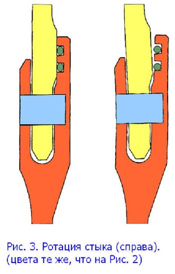 И ещё одно важное обстоятельство, относящиееся к функционированию ускорителя. В момент запуска за счёт приложения давления более тонкие по сравнению со стыком стенки секций приобретают бочкообразную форму, при этом хвостовик несколько проворачивается и резиновые кольца выходят из контакта с ним; зазор расширяется по мере нарастания давления в ракете. Это явление называется ротацией стыка (Рис. 3). Для обеспечения уплотнения резина должна расширяться достаточно быстро, чтобы закрыть зазор, но, в любом случае, при запуске ракеты зазор долю секунды остается открытым. Таким образом, эластичность резины становится совершенно необходимым условием функционирования данной конструкции.
