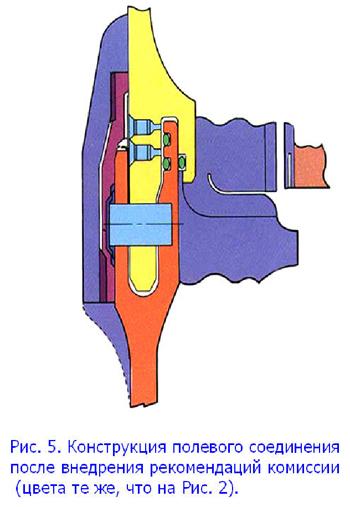 Со всей ясностью выводы из вышеперечисленных фактов материализованы в конструкции этого же стыка секций после реализации рекомендаций Комиссии [2], представленной на Рис. 5. Теперь видно, кто был признан главным виновником - нет и в помине злосчастной замазки, сгубившей "Челленджер".