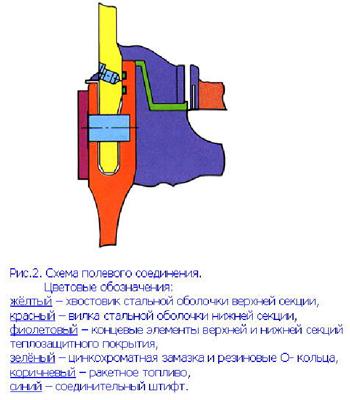 Через несколько минут от орбитальной ступени отделяется внешний топливный бак - это происходит гораздо выше в атмосфере, - который сгорает на траектории падения на землю. Твердотопливные ускорители состоят из нескольких секций. Между этими секциями существует два типа стыков (горизонтальные линии): "заводские соединения" собирают на заводе "Мортон Тиокол" в Юте, и "полевые соединения", которые собирают и герметизируют перед каждым полетом -- в Космическом Центре Кеннеди во Флориде. Вот в районе одного из этих соединений, нижнего полевого, и прорвались раскалённые газы, что привело к катастрофе. Конструкция стыка приведена на рисунке 2: