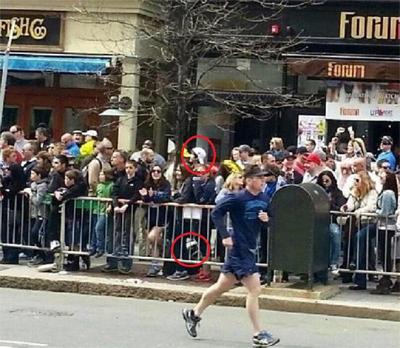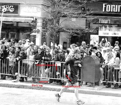 Ниже будут показаны два фото, первое из них якобы подтверждает место, где Джохар положил свой рюкзак с предполагаемой бомбой (хотя мощная пропаганда уже не употребляет слово "предполагаемый"). - На нем рюкзак прислонен к загородке, а Джохар виден в достаточно плотной толпе далеко от загородки. Но в других видео и отчетах было сказано, что он "на четыре минуты прислонился к дереву [дерево тоже видно на фото, оно совсем не у загородки] , положил рюкзак на землю около своей ноги, позвонил брату и ушел, оставив рюкзак. Почти тут же раздался первый взрыв, а через 12 секунд - второй". Как видно на фото, вряд ли он смог пробраться, не обратив на себя внимание, через эту толпу от дерева до загородки и еще оставить рюкзак. Одна из жертв, Лю Лиджи, которая была около загородки, - почти вступила в рюкзак около ее ноги. Но это явно не был рюкзак Джохара. Надо заметить, что почти вся Америка носит в качестве сумок рюкзаки. Их надевают на детей с 3-4 лет. В день марафона также очень многие (особенно с детьми) были с рюкзаками, причем их часто ставили на замлю на короткое или длительное время, наблюдая за марафоном.