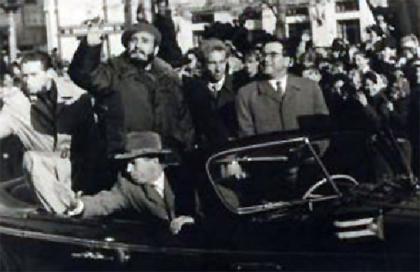После того, как он ушёл, я скучал в его кабинете ещё около часа, выходил на балкон и смотрел на всё растущую внизу толпу. Некоторые люди держали портреты Кастро и кубинские флаги. Вдруг людское море зашумело, заколыхалось, подняли повыше портреты - милиция расчищала дорогу. Показался длинный кортеж "чаек" и чёрных "волг". В головной открытой машине в тёплой куртке стоял Кастро рядом с белобрысым молодым человеком (я с ним позднее познакомился - это был Коля, переводчик и соглядатай, которого КГБ приставил к кубинцам). Вокруг них сидели охранники и ладонями отпихивали рвущихся к машине восторженных обожателей Фиделя. Вся вереница без остановки въехала на территорию завода через большие ворота рядом со зданием, где я стоял на балконе второго этажа.