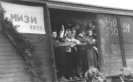 На автобусе от института мы доехали до Рижского вокзала. По дороге встречались грузовики с целинниками, украшенные лозунгами "Дадим хлеб", "Догоним Америку".