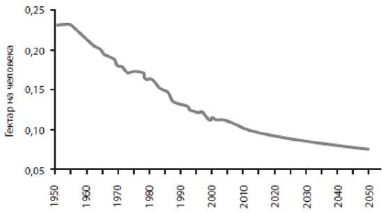 Так, в период 1950-81 гг. общая площадь земли, возделываемой под зерновые культуры, выросла в мире с 587 млн га до 732 млн. га, т.е. на 25%. Однако в расчёте на душу населения она сократилась за тот же период на 30% (с 0,23 до 0,16 га). И хотя в 1990-е гг. общая площадь возделываемых земель была на 15-20% выше, чем в середине века, но рост населения (более чем вдвое) обесценил эту прибавку. В результате площадь пашни в мире на душу населения сократилась против 1950 г. ровно вдвое (0,12 га). А если заглянуть на несколько десятилетий вперед, то, согласно прогнозу, к 2050 г. на душу населения в мире будет приходиться около 0,08 га земли (в некоторых странах даже меньше - 0,06-0,07 га), что соответствует небольшому приусадебному участку.