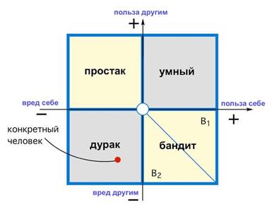 Положение точки внутри квадрата характеризует средневзвешенное поведение человека за долгое время. К примеру, рассмотрим некоего индивидуума с бандитским поведением (вор, убийца, жулик, и т.п.). Для него точка будет где-то в квадрате "бандит". Если это "идеальный" бандит, она расположена прямо на диагонали квадрата, и чем жёстче бандит, тем ближе точка к нижнему правому углу. "Идеальный" бандит здесь означает, что его прибыль точно равна потере другого, так как точка равноудалена от обеих осей. Скажем, если бандит ограбил кого-то на $100 - это польза ему, а тот, кого он ограбил потерял только $100, то есть прибыль бандита точно равна убыли жертвы. Однако, если прибыль бандита больше, чем $100 (скажем, использовал эти деньги на подкуп полицейского и тем избежал ареста), то он будет располагаться где-то в подсекторе В1, то есть ближе к квадрату "умный". Жизнь показывает, что таких умных бандитов не так уж и много. Чаще бывает наоборот: если его прибыль меньше потерь жертвы (скажем, убил кого-то и ограбил, чтобы поиграть в казино), окажется в подсекторе В2, то есть ближе к квадрату "дурак". Пример такого глупого бандита - Маршал Жуков, который без зазрения совести мог положить на войне сотни тысяч солдат лишь для того, чтобы угодить Сталину и заработать лишнюю побрякушку на китель. Как мы знаем, таких дураков-бандитов большинство.
