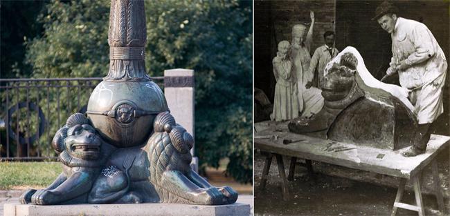 В семейном альбоме дедушки сохранилась фотография, запечатлевшая как он извлекает из гипсовой формы базу хорошо известного всем москвичам фонаря гоголевского комплекса, составленную из трех смотрящих в разные стороны львов.