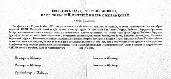 Манифестом в 10 день Апреля 1832 года установлено сословие почетных граждан на правах, в оном предначертанных; а как верноподданный Наш Московский второй гильдии купец и кавалер ордена Св. Станислава 3 ст. Эрих-Готфрид-Вениамин Эдуардов Рудольфов Виллер представленными актами доказал право на почетное потомственное гражданство, то, возводя оного Эриха-Готфрида-Вениамина Эдуардова Рудольфова Виллера с женою Эммою-Маргаритою Александровою Михайловою, сыновьями Александром-Бруно, Николаем-Александром, Леонидом-Августом-Альфредом, Робертом-Александром-Эдуардом, Бернгардом-Оскаром-Эдмундом и дочерьми Лидиею-Каролиною и Женни-Каролиною-Эммою в сословие почетных граждан всемилостивейше повелеваем пользоваться как ему так и его потомству всеми правами и преимуществами Манифестом сему сословию дарованными. В свидетельство чего повелели МЫ сию грамоту Правительствующему Сенату подписать и государственною НАШЕЮ печатью укрепить.