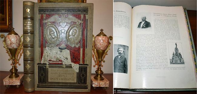 Вот как аукционное общество описывает сей антикварный фолиант: «Полукожаный художественный переплет, роскошное золотое и цветное тиснение с барельефами Романовых, художественное тиснение и орнаметальные украшения! Большой альбомный формат: 35,5 х 27,5 см, вес ? 6 кг! Кожаный бинтовой корешок с богатым золотым /глубоким!/ тиснением! Стилизованные цветные форзацы с гербами России, торшированный обрез блока, шелковое ляссе!».