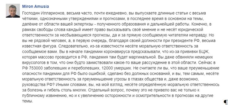С началом пандемии, когда в РФ ещё практически не было официально зарегистрированных случаев заболеваний, Илларионов утверждал, что пандемия страны не коснётся. Он однозначно связал своё предсказание с тем, что в РФ проводится почти поголовная прививка БЦЖ. Он упрекал крупного немецкого вирусолога, автора современной версии этой вакцины, в заимствовании его, Илларионова, идей в этой области. Было ясно, что автора несёт и от него "за версту разит хлестаковщиной". Когда РФ вошла в пандемию в полной мере, заняв вторую строчку в ежедневном печальном её отсчёте, Илларионов уже перекинулся на обвинение китайских вирусологов в создании зловредного вируса, нападал на ВОЗ за эпидемиологические ошибки, т.е. писал явно вне области своей компетенции. Его длинные статьи страдали от явного непрофессионализма и односторонности, что, на мой взгляд, нетерпимо даже для публицистики на научную тему. Я регулярно отвечал критикой, и был отнюдь не единственным, кто это делал, возможно, лишь наиболее упорным, напоминающим ему историю про роль БЦЖ.