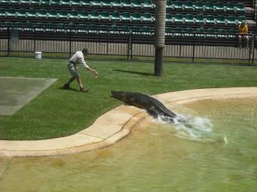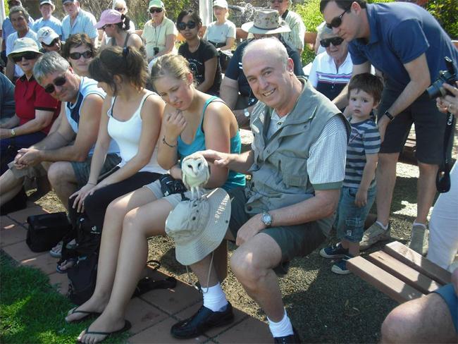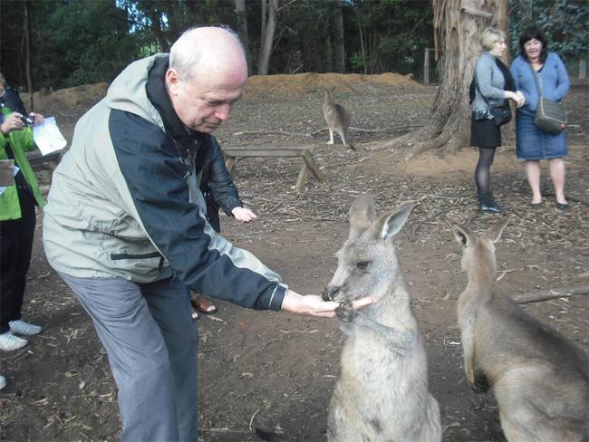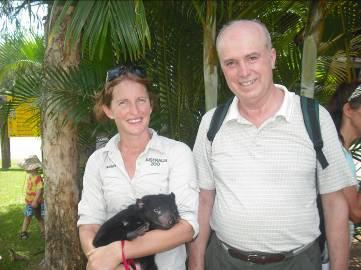 На посещение зоопарка было отведено 3 часа. Времени, казалось бы, достаточно, но надо было привести себя в порядок. Погода стояла жаркая, солнечная и достаточно влажная. Очень хотелось пить. Подойдя к киоску с прохладительными напитками, я ознакомился с ценами. Бутылка холодной воды стоила 4 австралийских доллара. Даже такая завышенная цена не утолила мою жажду. Я поинтересовался, можно ли рассчитаться американскими долларами, на что получил отрицательный ответ. Не уважают в Австралии наши доллары. Обменного пункта в зоопарке не оказалось. Я предложил кредитную карточку. Уезжая, я на двух кредитных карточках открыл три посещаемые нами страны на срок пребывания в них. Первая карточка почему-то не сработала. У моей жены появились совсем ненужные волнения и возник испуганный риторический вопрос: почему? Мы предложили продавщице попробовать ещё раз. Результат оказался тем же. Вторая кредитка сработала. Купив две бутылки воды, мы начали свой тур по зоопарку. Коллекция увиденных животных, птиц и пресмыкающихся оказалась уникальной. Мы старались посмотреть все предложенные шоу зверей и птиц. В зоопарке расположен стадион, где на поле-арене с бассейном, огражденной двойным сетчатым забором, служители зоопарка показывали выступления своих питомцев: крокодилов, слонов и разных прочих хищников. Очень впечатлило появление местных птиц всевозможных расцветок и размеров. Они вылетали с разных концов стадиона и пролетали над трибунами в непосредственной близости от зрительских голов, чем вызывали большой восторг не только у детей, но и у взрослых. Этот птичий хоровод кружил над стадионом, издавая уникальный набор звуков от щебетания до гортанных криков попугая, и после положенных кругов почёта разлетелся по своим клеткам. Работников зоопарка с питомцами на руках можно было встретить по всей территории. Надо было получить разрешение, чтобы погладить на вид очень покорных и безобидных хищников. Тасманского дьявола девушка мне не разрешила потрогать и я ограничился только фотографией. Я видел этого хищника при кормлении в других зоопарках страны. Он очень впечатляет, перегрызая и измельчая всё, что ест, а ест он всё подряд, включая кости любых размеров и жесткости.