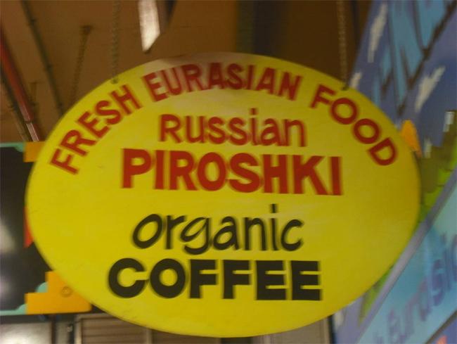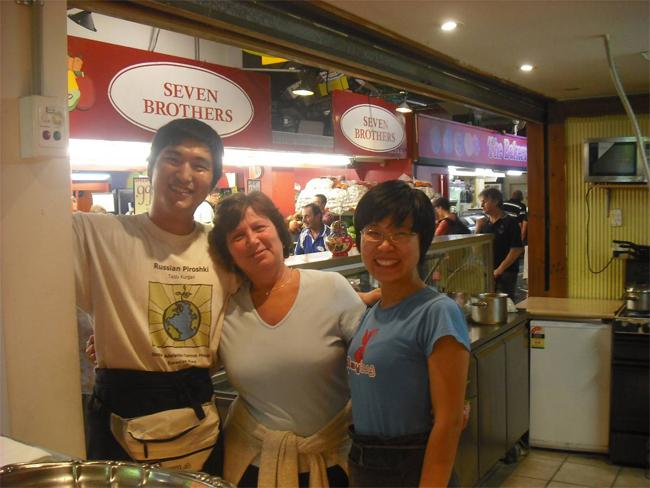 После городской экскурсии нас выпустили у крытого рынка и дали время на обед. Среди прочих экзотических общепитов рынка наш гид упомянул "Русские пирожки". Мы тут же отправились на поиск земляков. Совершив два полных круга по рынку, мы не нашли заветного заведения. Мы нашли польскую, греческую и итальянскую кухню, расспрашивали хозяев, но никто не мог припомнить о существовании такого ресторана. Потеряв надежду мы направились к выходу и тут неожиданно моя жена заметила нужную нам вывеску. Это был небольшой отсек рыночного ряда, где располагались кухня, прилавок и три столика. Обширное меню, написанное мелом на школьной доске, пестрило такими знакомыми названиями, как гуляш, борщ, голубцы и налистники. Мы решили познакомиться с хозяевами, которые были приятно удивлены нашим посещением. Ими оказалась супружеская китайская пара. Я подумал, может это какое-то забытое колено русских сибиряков, но всё объяснялось намного проще. Этот громкого названия ресторан был основан 8 лет назад неким Димой, китайские ребята работали на него 4 года , а потом перекупили бизнес, оставив прежнюю вывеску. Мы с ними общались по-английски, русскому они не научились у прежнего работодателя, да он им и не был нужен, поскольку русскоговорящих клиентов у них почти не было. Мы заказали исконно русскую еду: борщ, голубцы и вареники. Всё, на редкость, оказалось вкусным. Они любезно согласились с нами сфотографироваться.