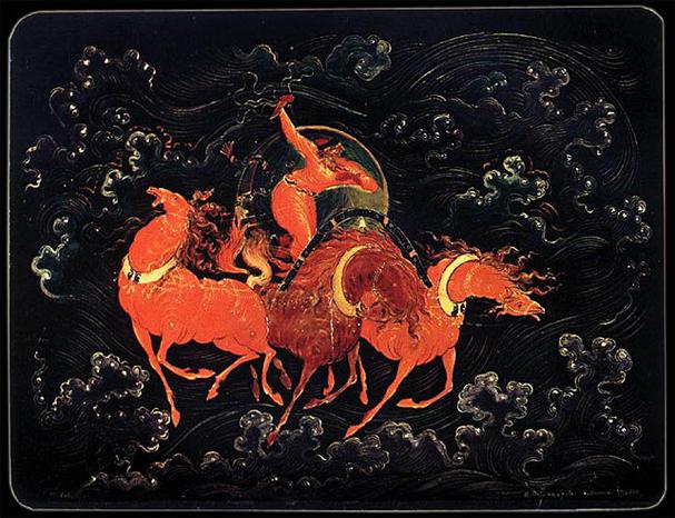 На серебром подкованном коне.