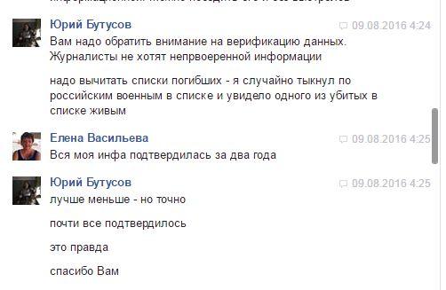 Предчувствуя подобное, я ввела новых людей в состав админов. И это помогло спасти работу проекта. На целых полгода… В день операции все первые админы проекта сообщили мне, что покидают проект груза-200, у них внезапно появились средства на создание сайта. И Конечно же, они создали свою группу в Фейсбуке, утащив наш слоган «Груз-200 правду не скрыть» к себе в название. Сейчас эта группа практически не работает. Но тогда группа Бутусова постаралась начать распыление информации об убитых российских наемниках.