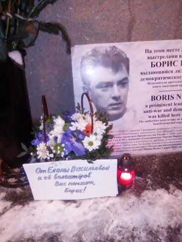 И еще штрих. Наши волонтеры из Москвы впервые за прошедшее с момента убийства Бориса время, принесли цветы на место убийства на мост с подписью, что это цветы от Елены Васильевой и волонтеров. И было это поздно вечером 18 февраля 2021 года. 19 февраля я опубликовала пост и фотографии с этими цветами в группе в Фейсбуке и в Твиттере, а 20 февраля на мост нагрянула полиция и зачистила место от цветов. Сутки там было дежурство полицейских постов. Ни кому не позволяли возлагать там цветы, кроме... внезапно пришедших на мост Ильи Яшина и Владимира Кара-Мурзы. Их не тронули.