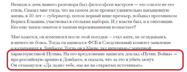 Внезапно я обнаружила, что Борис Немцов в начале марта 2015 года исключил меня из своих друзей. Напомню, что убили его 27 февраля. То есть кто-то из его близких, поверенных, стал вычищать его аккаунт, удаляя всех не нужных. Чуть позже аккаунт Бориса Немцова покинул и нашу группу "Груз-200 из Украины в Россию".