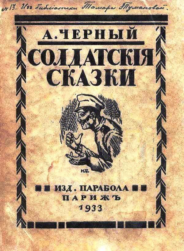 Первая из них: А. Черный, Солдатскiя сказки, Изд. ПАРАБОЛА, Парижъ, 1933, стр. 271. Обложка в стиле Art Deco работы замечательного русского художника И.Я. Билибина. На строгой бумажной обложке от руки написано: «№13. Изъ книг Тамары Тумановой». Сама подпись автора — А. Черный — непривычна. Обычно его псевдоним выглядел как "Саша Черный".