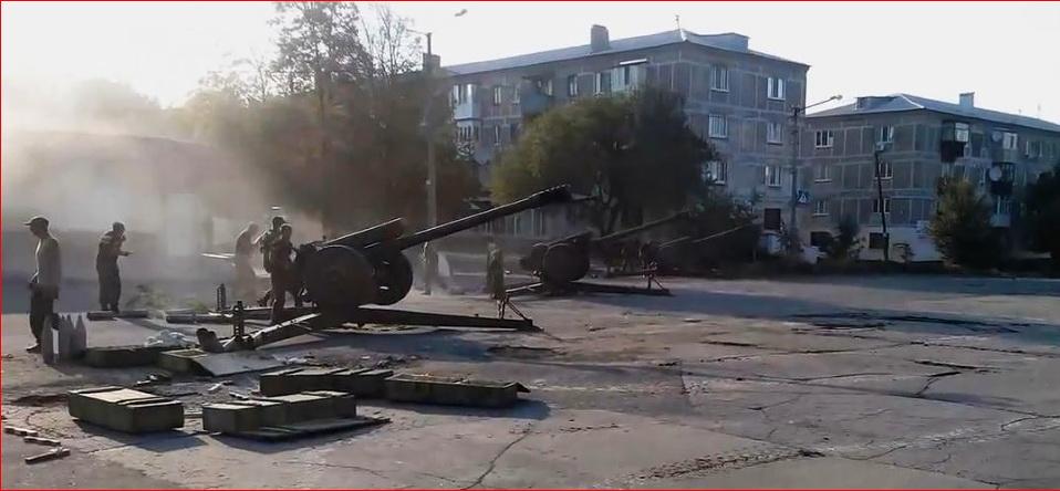 Бригада «Оплот» ДНР ведет огонь из гаубиц прямо посреди улицы в г. Шахтерск (Украина, Донбасс, лето 2014 года).