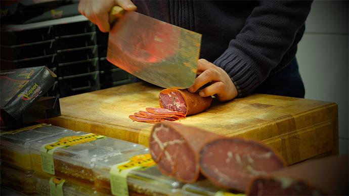 Нарезается пастырма особым ножом, толщиной и размерами больше смахивающий на небольшой топор.