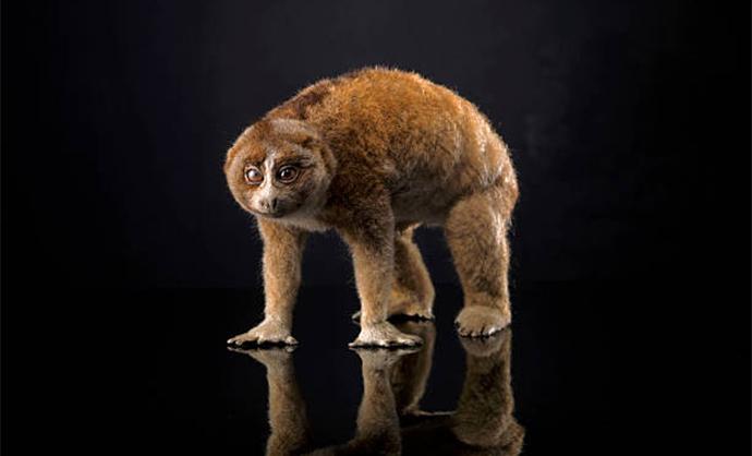 Пока не началась съемка, появилась возможность рассмотреть тонкого лори вблизи. Он оказался небольшим, размером с кота, зверенышем. Бесхвостое, тонкое тельце укутано густой серой шерсткой.