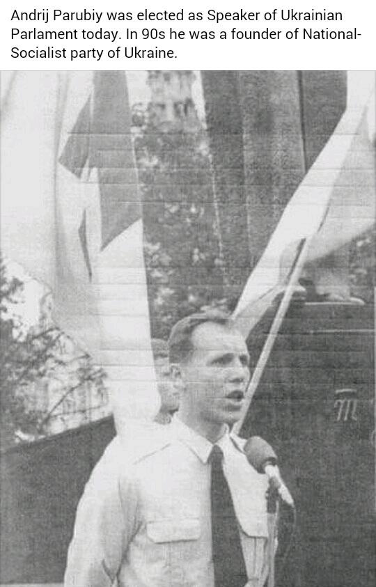 Когда потом Парубий стал спикером украинского парламента, в западной прессе появились любопытные фотографии из его молодости: странная униформа, флаги, напоминающие «азовские», и утверждение, что он якобы состоял в национал-социалистической партии. Но на это обратили внимание лишь в России: дескать, смотрите, кто стал спикером в постмайданной Украине! В самой Украине этим уже мало кого можно было удивить, а вот отсутствие реакции на Западе было странным. Ведь в то время, когда американская пресса и Конгресс прессовали «Азов» за его символику и «неонацистскую» идеологию, один из её создателей спокойно ездил с официальными визитами в Вашингтон в качестве главы украинского парламента. Да-да, один из создателей!