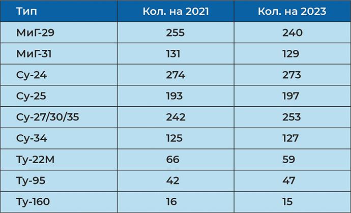 Если сравнить количество ударных самолетов ВС РФ в 2021 г. и 2023 г., то оно окажется приблизительно равным. Все, что производится, уничтожается ВС Украины, которые еще не получили современную авиацию.