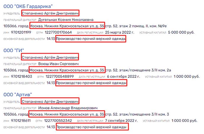 ООО «ОКБ Гардарика» было создано 25 марта 2022 г. Вид деятельности – производство прочей верхней одежды. Кроме этой фирмы Артем Степаненко учредил в сентябре 2022 г. ООО «ГИ» и ООО «Артив» с таким же видом деятельности, как и у ООО «ОКБ Гардарика». Все компании зарегистрированы по одному адресу.
