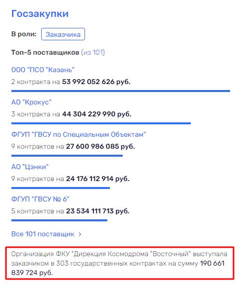 Президент РФ, говоря о воровстве на «Восточном», явно был дезинформирована, так как общая сумма контрактов ФКУ «Дирекция Космодрома «Восточный», которое заключает договоры с подрядчиками, составляет 190.6 млрд руб.