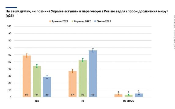 Р. О.: Для меня отсылка к мнению неизвестных людей не является аргументом, потому как, например, в моем окружении, в котором нет чиновников, волонтеров и националистов, никто от войны не устал. Все ждут победы Украины. Согласно опросу Киевского международного института социологии (КМИС), опубликованному в «РБК-Украины», в мае 2022 года переговоры поддерживали 59% опрошенных, 37% были против, в августе 44% - за переговоры, 52% - против, в январе 2023 г. 29% - за, 66% - против. Общая тенденция роста числа противников переговоров налицо.