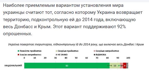 Сергей отвечает «Я живу в Украине, я общаюсь с людьми, я наблюдаю за людьми, интересуюсь всякой информацией на эту тему». Я тоже живу в Украине и общаюсь с людьми. У меня партнеры по бизнесу на Западной Украине, они ждут победу ВСУ. Всякая информация на эту тему, взятая неизвестно откуда, для меня не является аргументом. Вот данные исследования КМИС. По нему 92% опрошенных украинцев наиболее приемлемым вариантом установления мира считают возвращение к границам 1991 г.