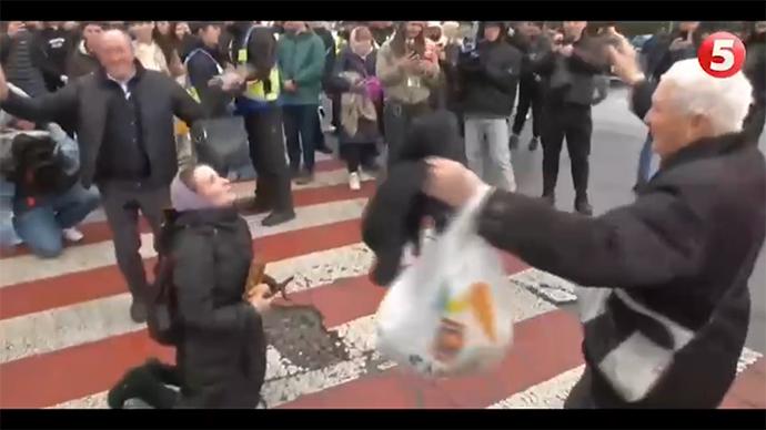 Ветер национальной идеи Украины…Толпа измывается над певчей хора Киево-Печерской лавры.