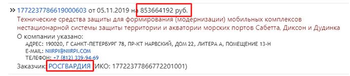 Если из контракта Росгвардии с НПП «Авиационная и морская электроника» было похищено 260 млн руб. (69%), то сколько могли увести из 853 млн руб.? Или следователи в эту сторону еще не смотрели? Катера на Крайний Север были доставлены осенью 2019 г., в это же время был заключен контракт Росгвардии с АО «НИИРПИ».