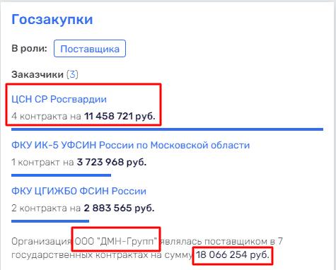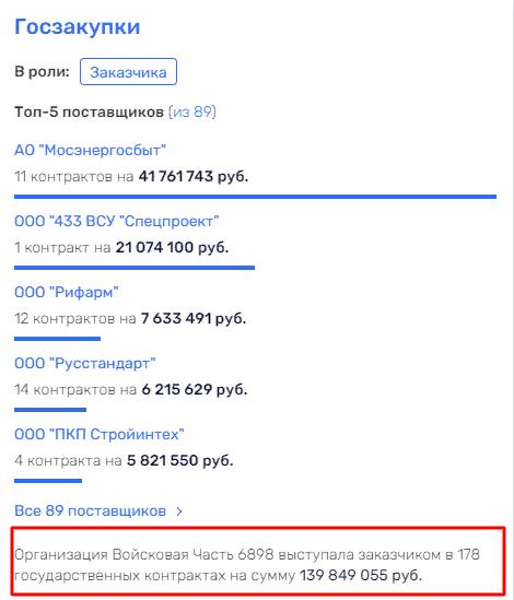 В контрактах в/ч 6898 также нет ООО «ДМН-Групп», да и общая сумма заказов всего 139.8 млн руб.