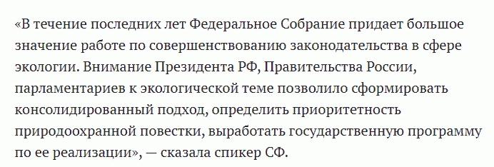 Предложение о создании экологического кодекса тоже не прошло, хотя Валентина Матвиенко и пыталась обосновать свою инициативу набором общих фраз.