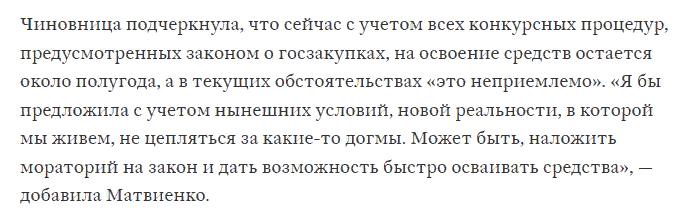 В феврале спикер СФ предложила ввести мораторий на закон о госзакупках для того, чтобы быстрее осваивать бюджетные средства. Безусловно, в нынешних условиях промедление с «распилом» государственных денег смерти подобно. Завтра «кормушки» уже может не быть.