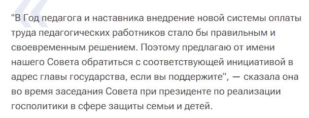В апреле спикер СФ предложила обратиться к Владимиру Путину, чтобы ввести новую систему оплаты труда педагогов. Взяла бы записалась на прием и довела свое предложение до президента РФ. А зачем? Она же понимает, что никто ничего вводить не будет, но зарисоваться лишний раз с заботой о педагогах момент не упустила.