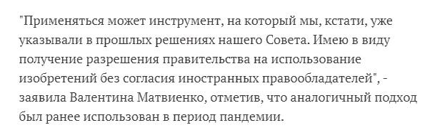 Предложение, которое спикер СФ сделала в конце апреля касалось всего мира. Матвиенко предложила использовать изобретения без согласия на то иностранных правообладателей.