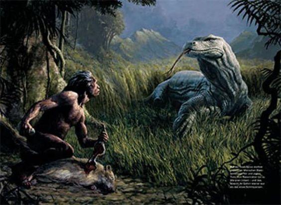 Однако к моменту прибытия на австралийский континент самых древних людей (предположительно туземцев Новой Гвинеи и островов Меланезии), климатические условия в этой части земного шара претерпели очень значительные изменения. В результате постепенного тектонического дрейфа австралийского материка на юго-запад и связанного с этим изменения направлений движения океанских течений количество осадков сократилось в несколько раз, а густые тропические леса уступили место не только обширным редколесным саваннам, но и всё более увеличивающимся каменистым пустыням и полупустыням. Тем не менее, даже в условиях очень медленно, но неуклонно наступающей аридизации, мегафауна австралийского континента была ещё богатой и разнообразной, а свирепых и очень опасных для людей ящероподобных монстров было более чем достаточно.