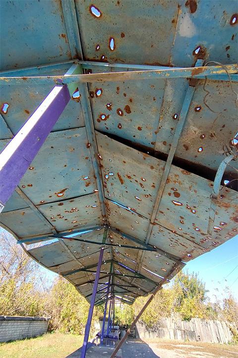 Покрытие над уличным "рынком" - местом, где местные продавали свои продукты. Крыша полностью "прошита" осколками снарядов.